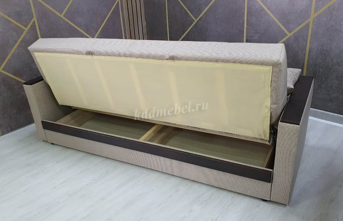 При трансформации требуется расстояние между диваном и стеной. Мебель является пристенной. Механизм «Книжка» прост и надежен в эксплуатации. Напольное покрытие в процессе раскладки не задействовано, Вы можете использовать пушистые ковры или дорогие паркеты. Емкость для хранения постельных принадлежностей с ламинированным основанием обеспечит Вам дополнительное пространство для хранения и сэкономит Ваше время при подготовке дивана ко сну. Ламинированное основание обеспечит простоту и удобство при уборке. Декоративные накладки из МДФ на подлокотниках и передней части короба, сочетают в себе представительность и элегантность, придают изящность дизайну